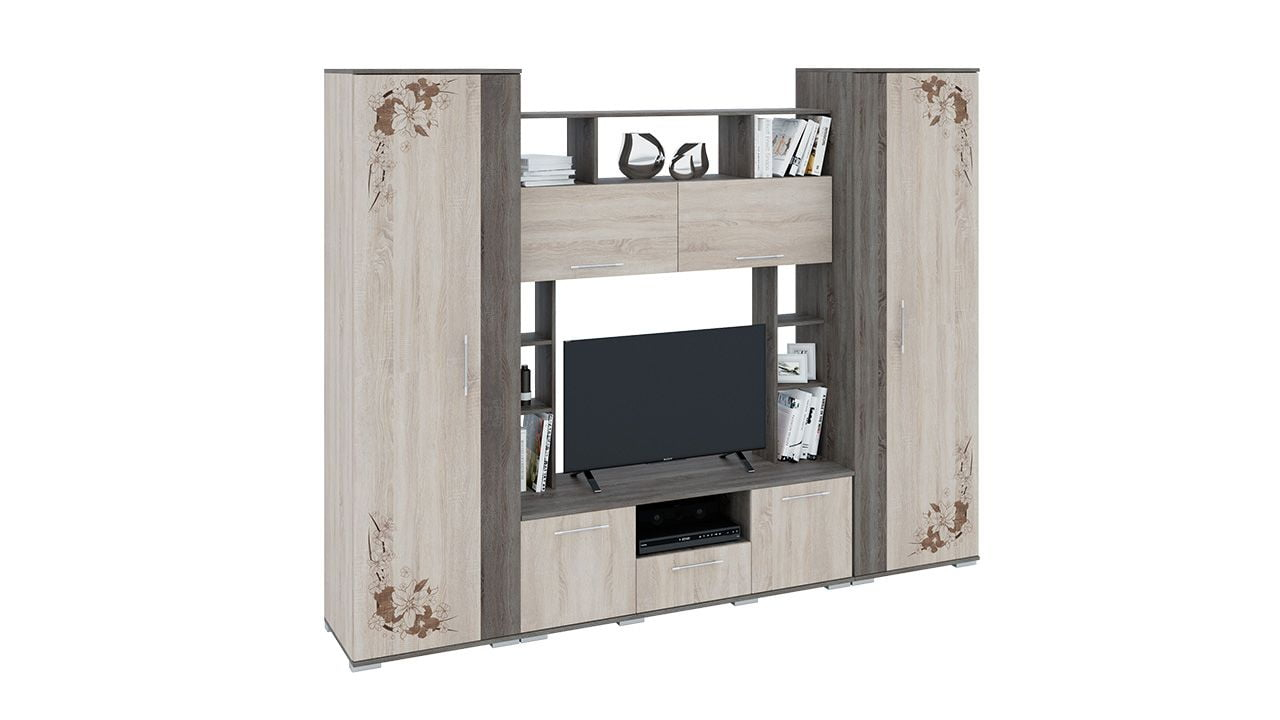 Стенка ТриЯ Белла прекрасно дополнит интерьер современной гостиной. Габариты изделия позволяют разместить еë как в просторной комнате, так в для небольшом помещении. Данная модель вбирает в себя такие качества, как практичность и вместительность. Все это обеспечивается благодаря наличию множества открытых и закрытых полок, а также широкой нише для телевизора, имеющей ширину 91,6 см. Полка для телевизионной приставки, расположенная под нишей для ТВ, а также объемный платяной шкаф делают стенку еще более функциональной. В качестве материала изготовления используется ЛДСП высокого качества. Цветовое решение дает возможность разместить стенку ТриЯ Белла в комнате как светлых, так и темных оттенков. Оригинальный рисунок на фасаде придает изделию уникальности и отличает среди других подобных экземпляров.