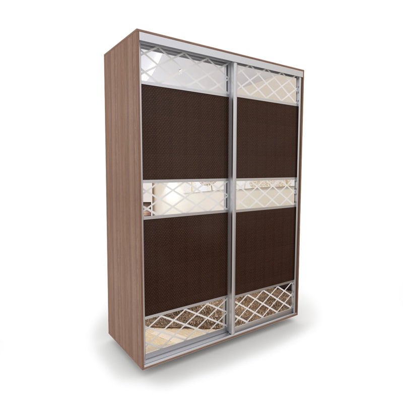 Двери купе выполнены в комбинации эко-кожи "Версаль" и зеркальной вставки с пескоструйной обработкой. Рисунок обработки "ромбы" фон зеркальный, рисунок - матовый. Для темных тонов ЛДСП корпуса используется темный цвет эко-кожи, для светлых тонов – светлая. Высококачественный толстостенный алюминиевый профиль цвета хром матовый.